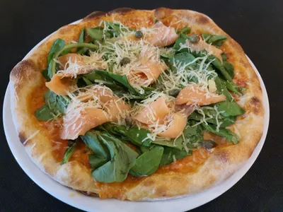 Pomodoro, mozzarella, alcaparra, rúcula, salmón ahumado, parmesano.