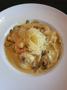 Rellenos con champiñón, nuez, ricotta. Salsa de champiñones, camarón ecuatoriano, crema, aliños.