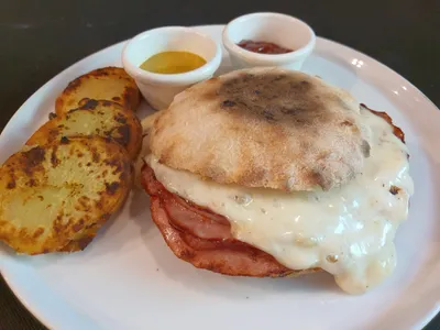 Pan hecho a mano con salmón ahumado, rúcula, alcaparras, palta, mayo, parmesano y un toque de aceite de oliva.